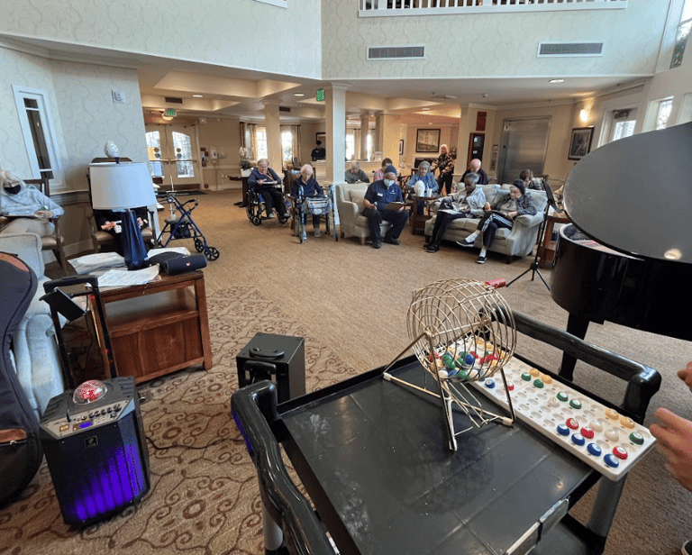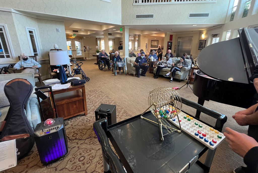 Volunteers hosting an exciting and competitive game of Bingo with seniors.