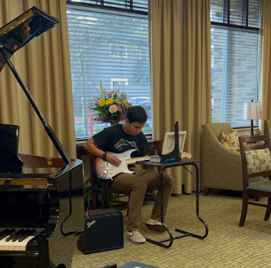 Thomas Biofort playing a rock song on the electric guitar.